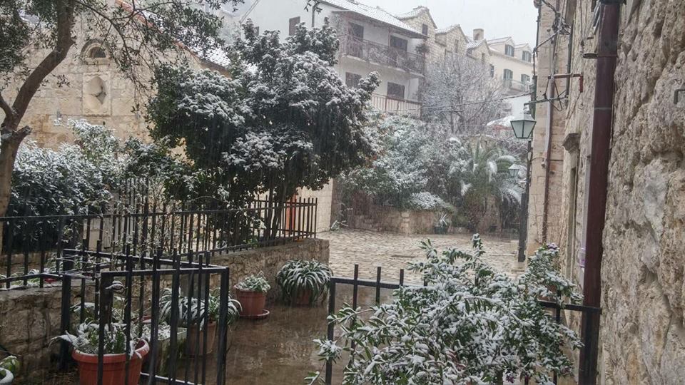 Hvar je jedan od najtoplijih gradova u Hrvatskoj ali nije ovih dana imun na snijeg. Pada i pomalo se zadržava a danas je 26.02.2018.godine .Županijski stožer CZ je zbog najava nepovoljnih vremenskih prilika DHMZ ,održao hitni sastanak gdje je bio uključen i Crveni križ Županije splitsko_dalmatinske. Tim povodom ukazana je potreba da se stave u pripravnost svi Interventni timovi gradskih društava CK u vremenu od 25.02. do 01.03. 2018.godine ,kako bi bili na raspolaganju građanima koji nisu mobilni,koji su bolesni ili su stradali zbog promjenjenih vremenskih okolnosti na koje nismo navikli.