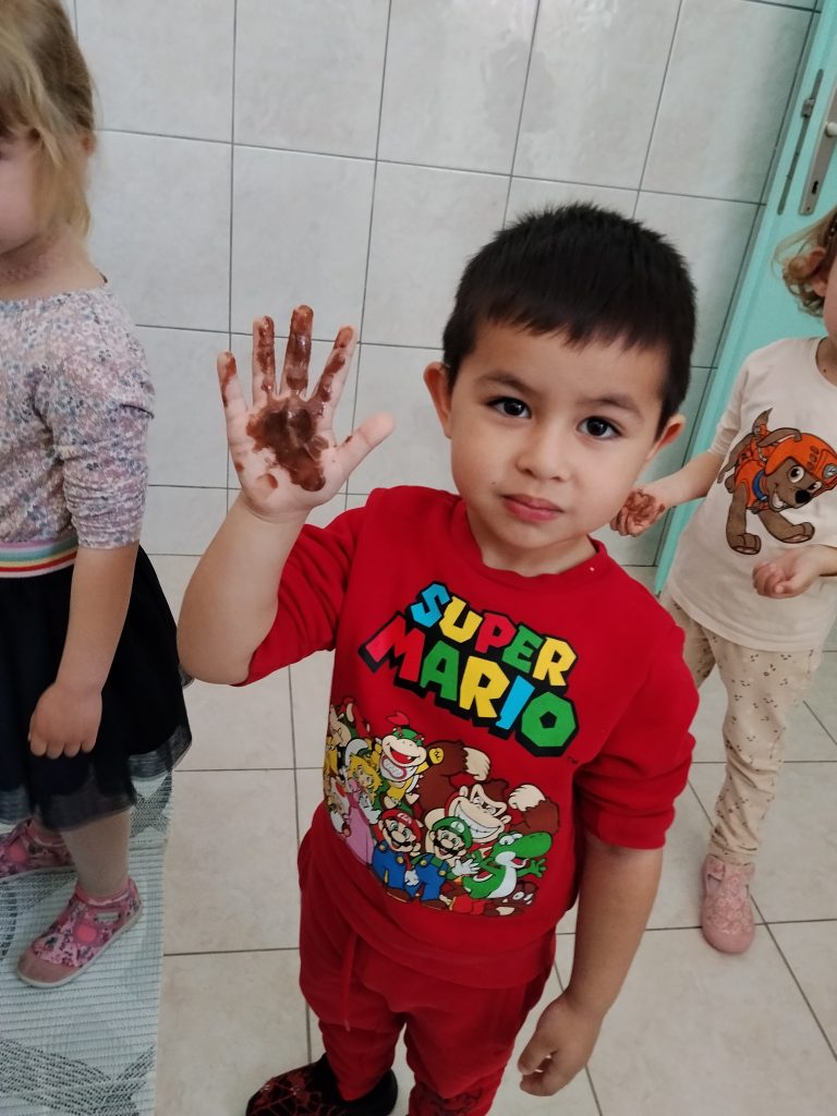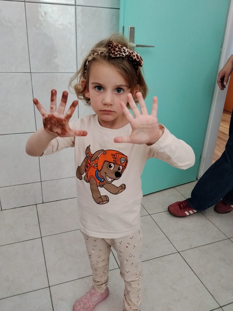 Kako bismo im na zabavan način pokazali koliko se bakterije, iako ih ne vidimo, lako prenose s osobe na osobu, proveli smo mali pokus koristeći čokoladni namaz te kroz rukovanje pokazali kako se “nečistoća” brzo prenosi s ruke na ruku.